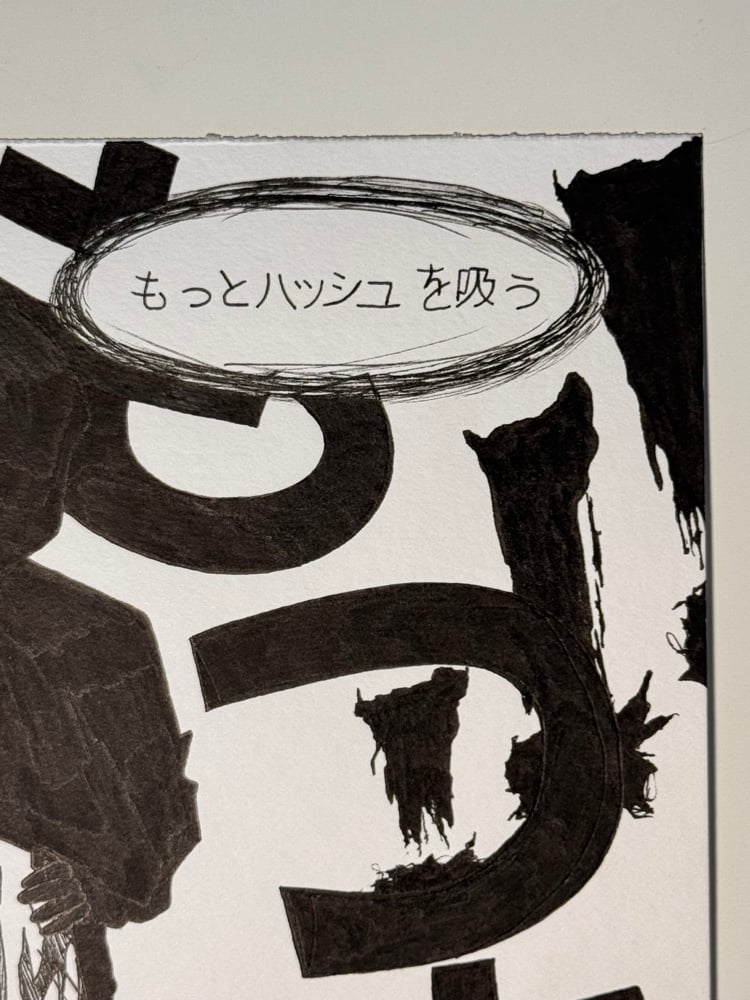 For the words in the drawing, here’s the translation: Smoke more hash…MORE!